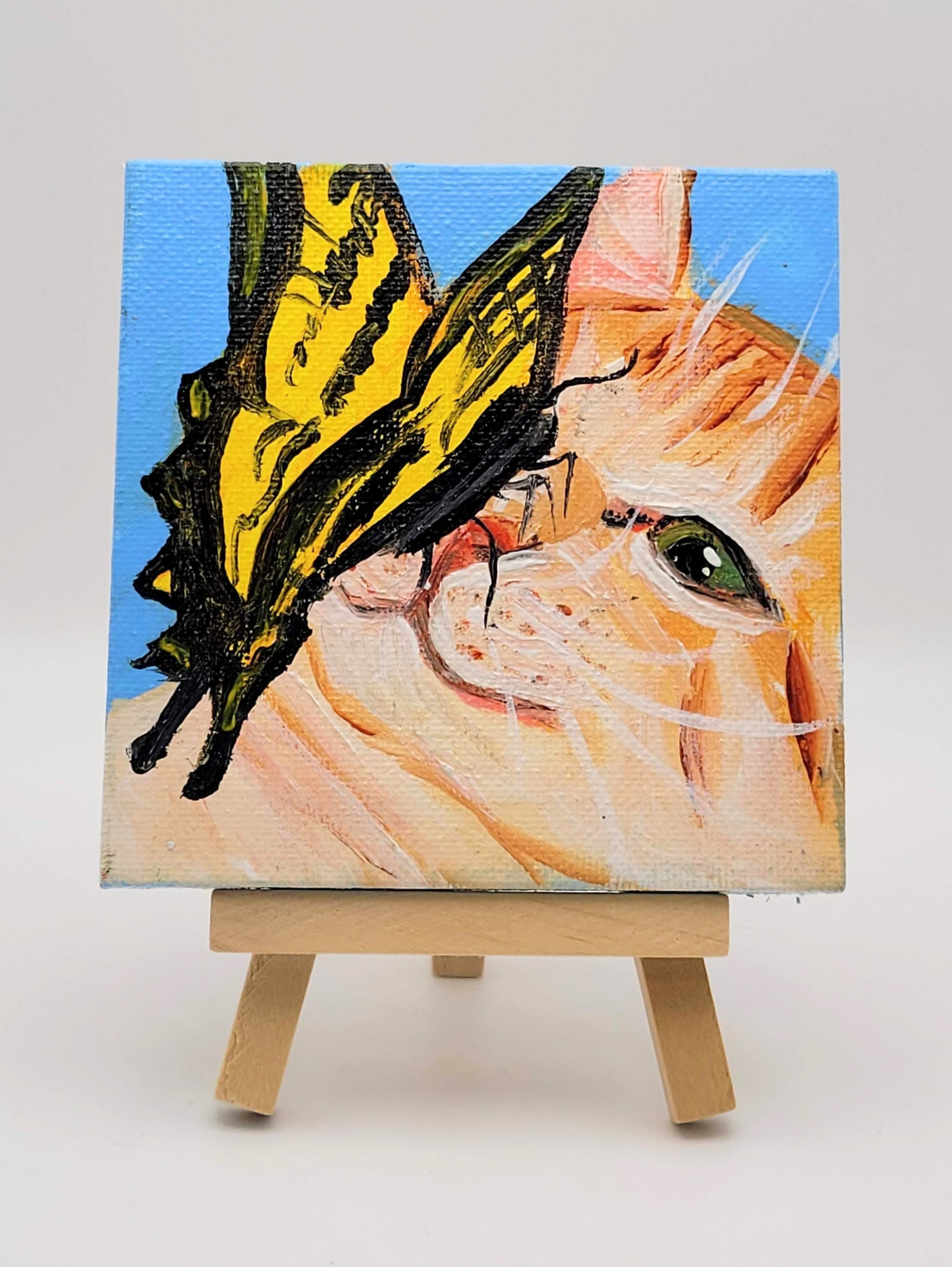 4in x 4in acrylic on canvas with mini wooden easel. This varnished mini piece of artwork is perfect for every space and guaranteed to brighten your day! Your shelf, desk, side table, mantle, any nook and cranny are great places to display this piece, but remember the possibilities are endless! Original painting by Faith Costa. Varnished. One of a kind!
